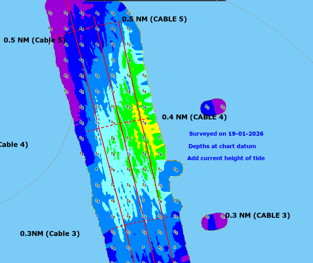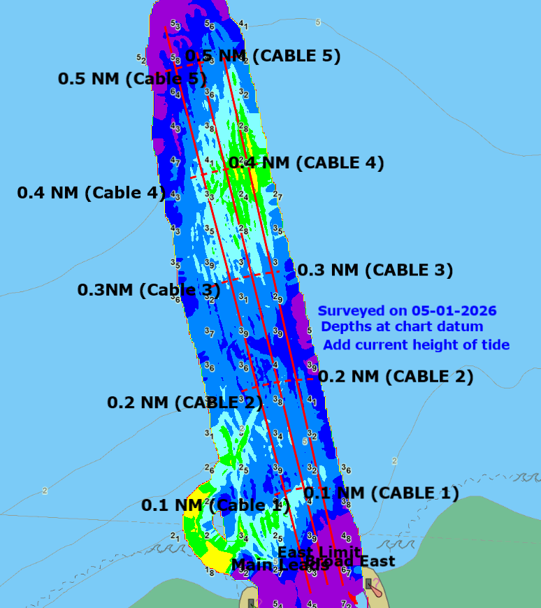 - East Limit: By day a line with the first black and white pole (to the east of the front lead) in line with the rear lead. At nighttime this pole has a red fluorescent lamp, which is to be in line with the rear lead green neon