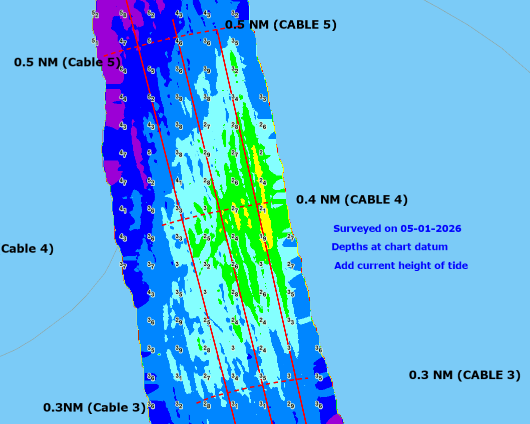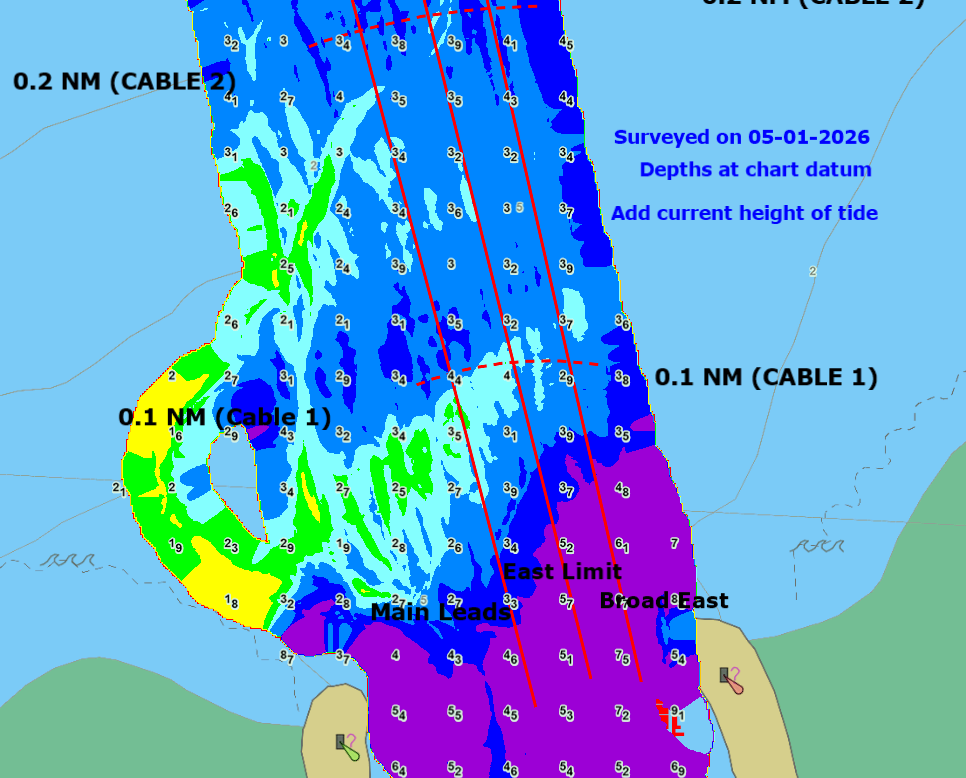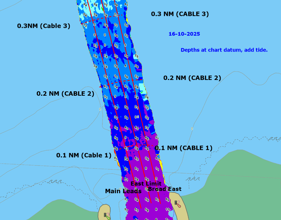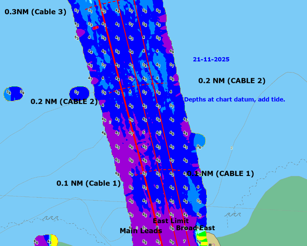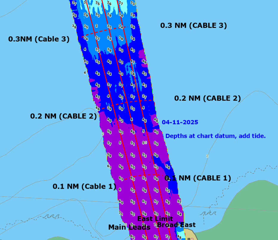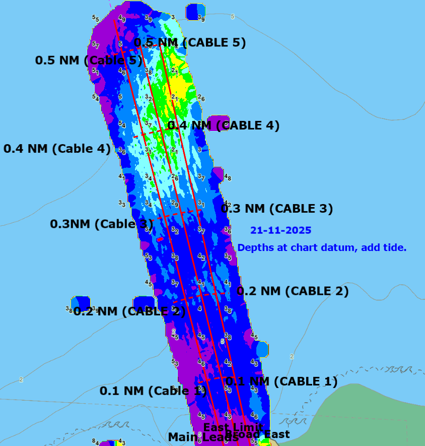 - East Limit: By day a line with the first black and white pole (to the east of the front lead) in line with the rear lead. At nighttime this pole has a red fluorescent lamp, which is to be in line with the rear lead green neon